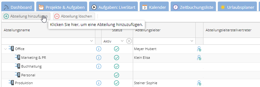 Abteilungsleiter und Abteilungsleiterstellvertreter einer Abteilung können alle Abteilungen unter dieser Abteilung einsehen, haben jedoch keinen Zugriff auf übergeordnete Abteilungen.