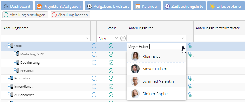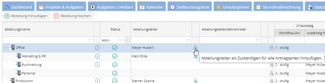 Wenn Sie den Abteilungsleiter bzw. den Abteilungsleiterstellvertreter als Zuständigen für sämtliche Anträge der jeweiligen Abteilung einteilen möchten, klicken Sie auf das Symbol neben dem Namen.