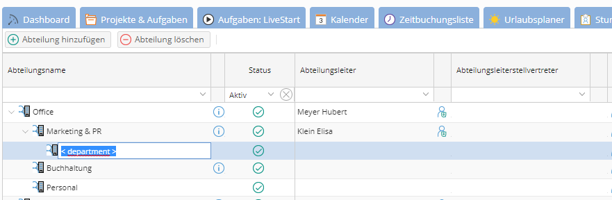 Um eine Unterabteilung anzulegen, wählen Sie die Abteilung aus, unter der diese angelegt werden soll. Anschließend klicken Sie auf . Die neue Abteilung wird nun direkt unter der Hauptabteilung eingefügt. Per Doppelklick auf die neu erstellte Unterabteilung kann der Name der Unterabteilung eingegeben werden.