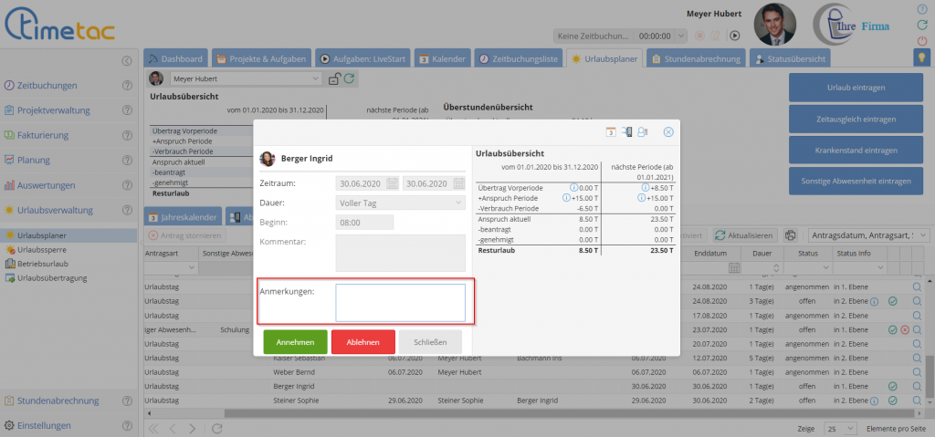 Ist diese Einstellung aktiviert, muss bei Ablehnung eines Urlaubsantrags eine Anmerkung verpflichtend eingetragen werden.