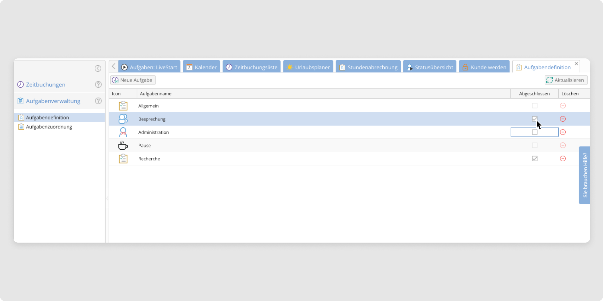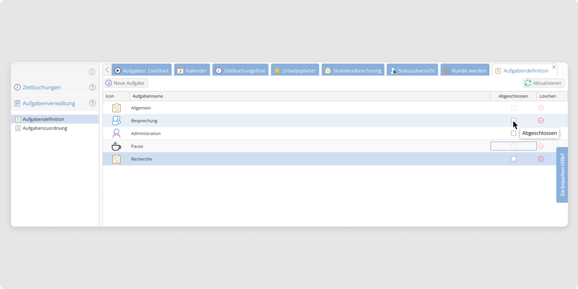 In diesem Artikel erklären wir Ihnen, wie Aufgaben abgeschlossen bzw. bereits abgeschlossene Aufgaben wieder aufgenommen werden können. Auf abgeschlossene Aufgaben kann keine Zeit erfasst werden, zudem ist es nicht möglich Zeitbuchungen auf abgeschlossene Aufgaben zu bearbeiten.
