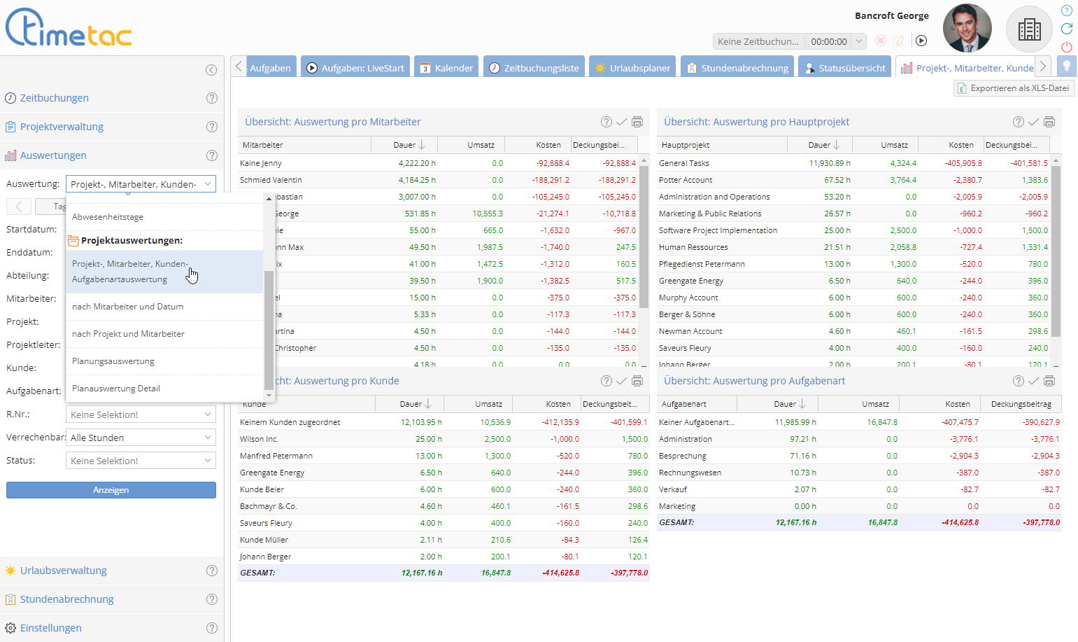 TimeTac bietet die Möglichkeit diverse Reports und Auswertungen über einzelne Mitarbeiter, einen speziellen Zeitraum, oder über Projekte und Aufgaben zu erstellen. Öffnen Sie im linken Seitenmenü den Unterpunkt . Wählen Sie die gewünschte Auswertung über das Dropdown-Menü aus und passen Sie Ihre Filterkriterien auf Ihre Wünsche an.