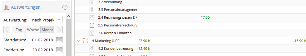 Sie können bei einer Auswertung den Zeitraum auf Ihre Wünsche anpassen. Über die Buttons können Sie zwischen , und als angezeigten Standard Zeitraum wählen. Über die können Sie zwischen den Zeiträumen springen. Um einen Report für einen genau definierten Zeitraum zu erstellen, wählen Sie das gewünschte und .