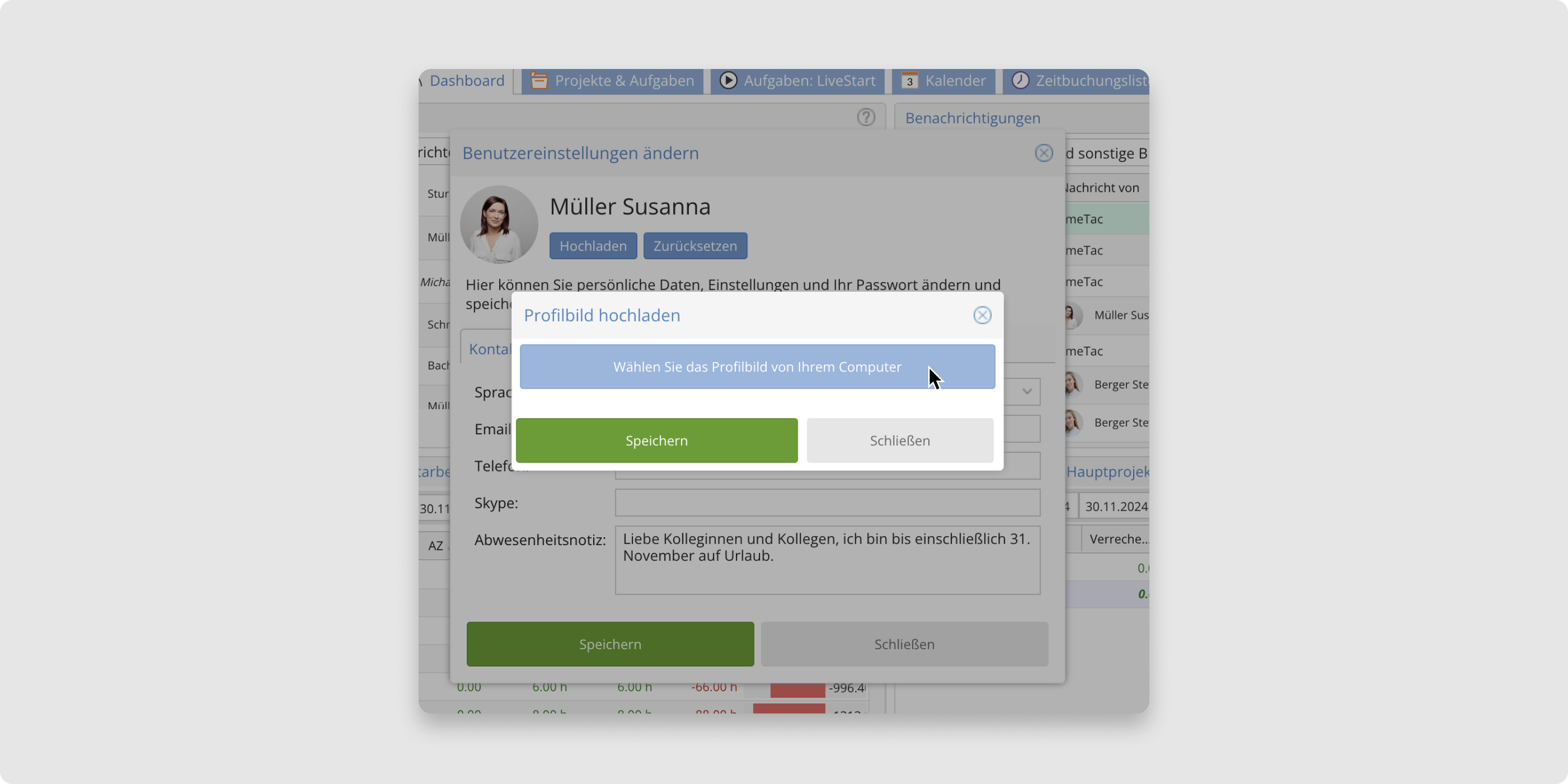 In TimeTac kann jeder Benutzer seine eigenen Einstellungen, Kontaktdaten und Passwörter anpassen. Außerdem kann ein eigenes Profilbild hochgeladen werden.