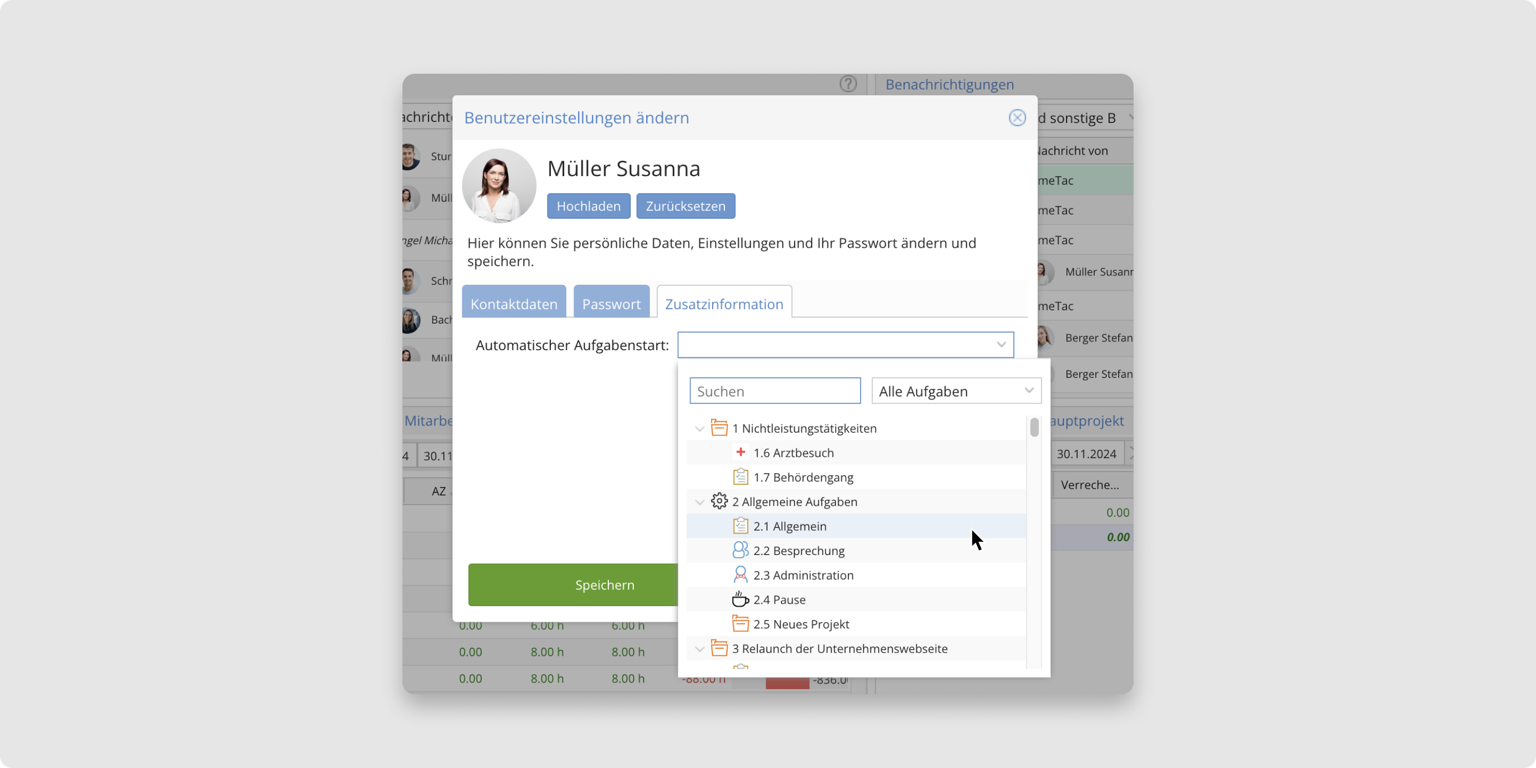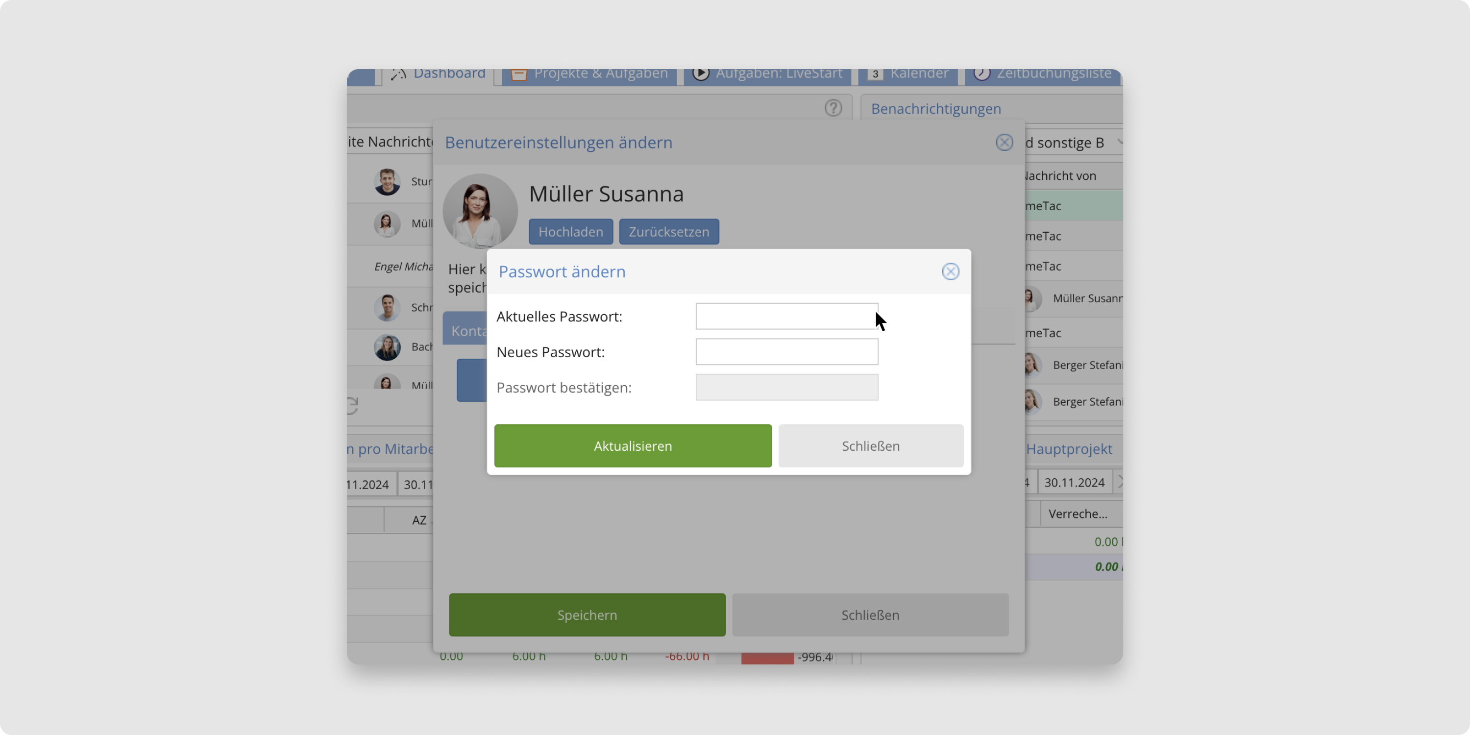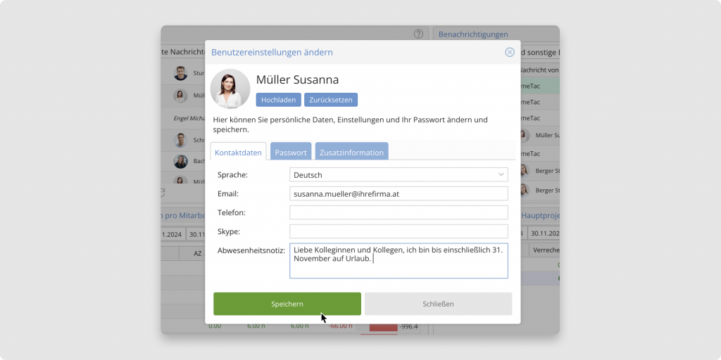 In TimeTac kann jeder Benutzer seine eigenen Einstellungen, Kontaktdaten und Passwörter anpassen. Außerdem kann ein eigenes Profilbild hochgeladen werden.