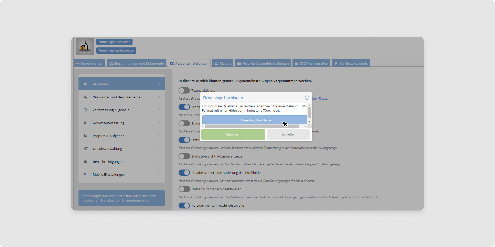 3. In einem weiteren Fenster wählen Sie Firmenlogo hochladen und laden Ihre Datei (im PNG-Format, mindestens 70px hoch) hoch.