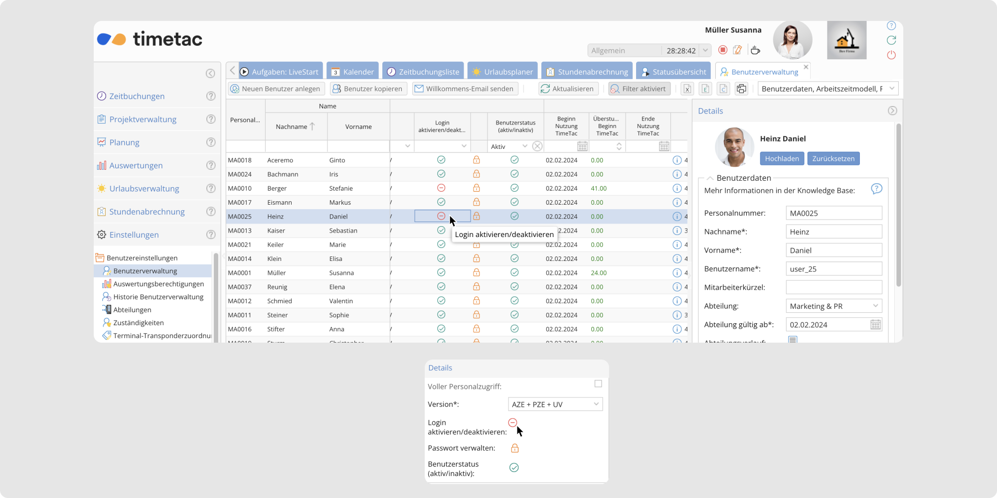 - Entweder Sie aktivieren den User in der Listenansicht unter Login aktivieren/deaktivieren oder in Details unter Benutzerdaten.