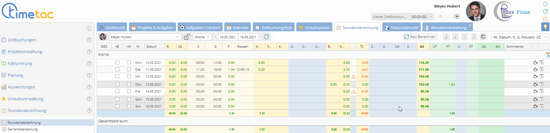 In der Stundenabrechnung reduzieren Sie den Arbeitszeitsaldo durch Eingabe der gewünschten Stunden in Spalte ÜA (Überstunden ausbezahlt). Zur besseren Nachvollziehbarkeit tragen Sie einen aussagekräftigen Kommentar ein.