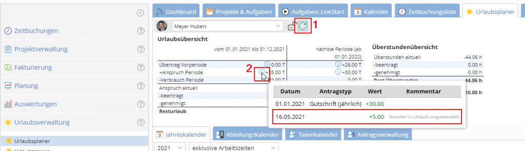 Im Urlaubsplaner klicken Sie auf „Aktualisieren“ (1), es wird nun der aktualisierte Anspruch angezeigt. Mit Mouse-Over auf dem blauen i-Symbol (2) erfolgt die Kommentar-Darstellung.