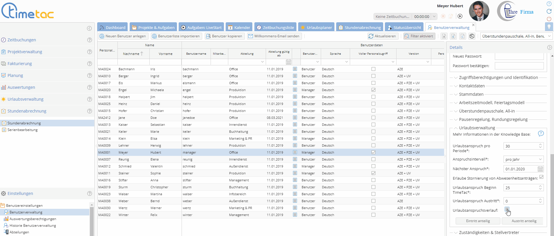Danach wechseln Sie in die Benutzerverwaltung und öffnen den Urlaubsanspruchsverlauf. Den Anspruch erhöhen Sie um die gewünschten Urlaubstage und tragen ebenfalls einen aussagekräftigen Kommentar ein.