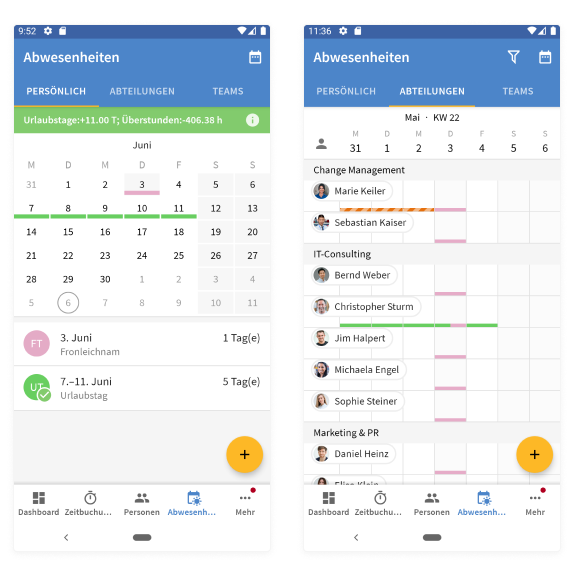 Ab jetzt können Sie einfach zwischen einem persönlichen Kalender mit allen Details und dem Abteilungs- oder Teamkalender wechseln. So behalten Sie alle Abwesenheiten im Blick und erleichtern sich die Abstimmung im Team.