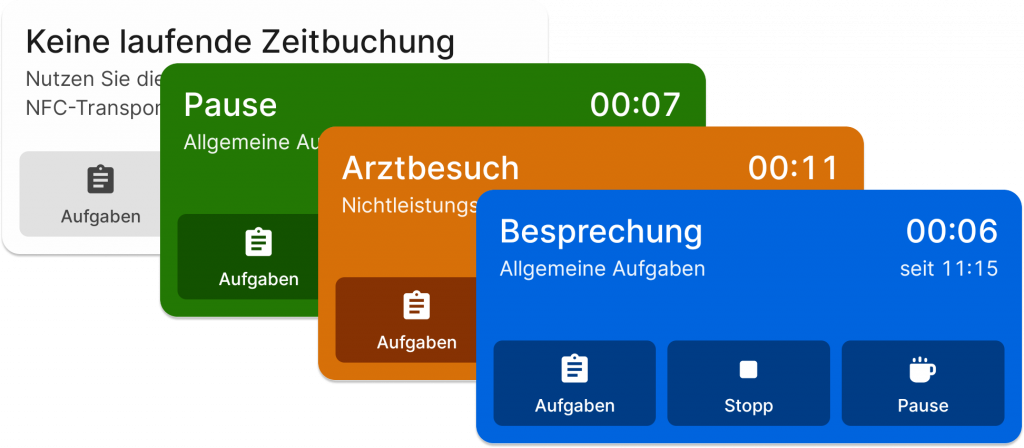 Wir präsentieren ein neues Design für die mobile Live-Zeiterfassung. Diese bieten einfachere Handhabung und eine klare Übersicht, ohne die gewohnte Funktionalität einzuschränken. Die bunten Hintergrundfarben zeigen auf den ersten Blick den aktuellen Zeiterfassungs-Status an. Viel Spaß beim Zeiterfassen!