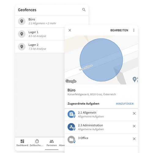 ‚Geofences‘ unterstützt Sie dabei falsche Zeitbuchungen zu vermeiden, indem ausgewählte Aufgaben nur an gewissen Orten gebucht werden können.