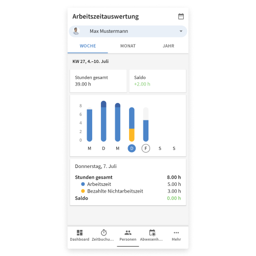 In dieser Version können Sie jetzt nicht nur auf die Übersicht der Stundenabrechnung zugreifen, sondern auch auf eine detaillierte Ansicht für sich selbst und alle Mitarbeitenden, die Sie verwalten. Tippen Sie dazu einfach auf die Übersicht der Person, die Sie sehen möchten.