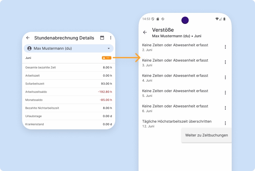 Klicken Sie auf das Warnsymbol in den Stundenabrechnungen, um direkt zur Übersicht aller Verstöße zu gelangen. Von dort aus können Sie mit einem weiteren Klick auf einen Verstoß bequem zum entsprechenden Eintrag springen und Korrekturen vornehmen.