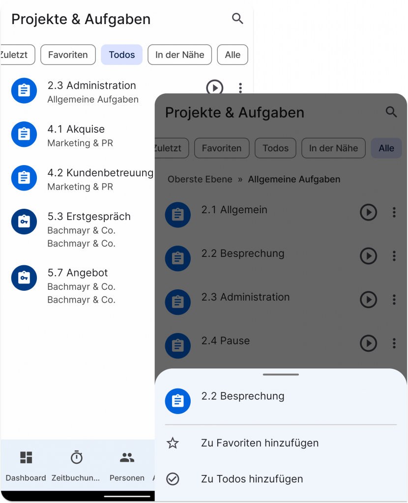 Wechseln Sie dazu in das Menü Projekte & Aufgaben. Tippen Sie auf das Mehr Symbol (︙) neben dem gewünschten Projekt oder der Aufgabe, um das entsprechende Menü zu öffnen. Weisen Sie einen Favoriten oder ein To-Do zu, indem Sie auf die jeweilige Schaltfläche tippen.