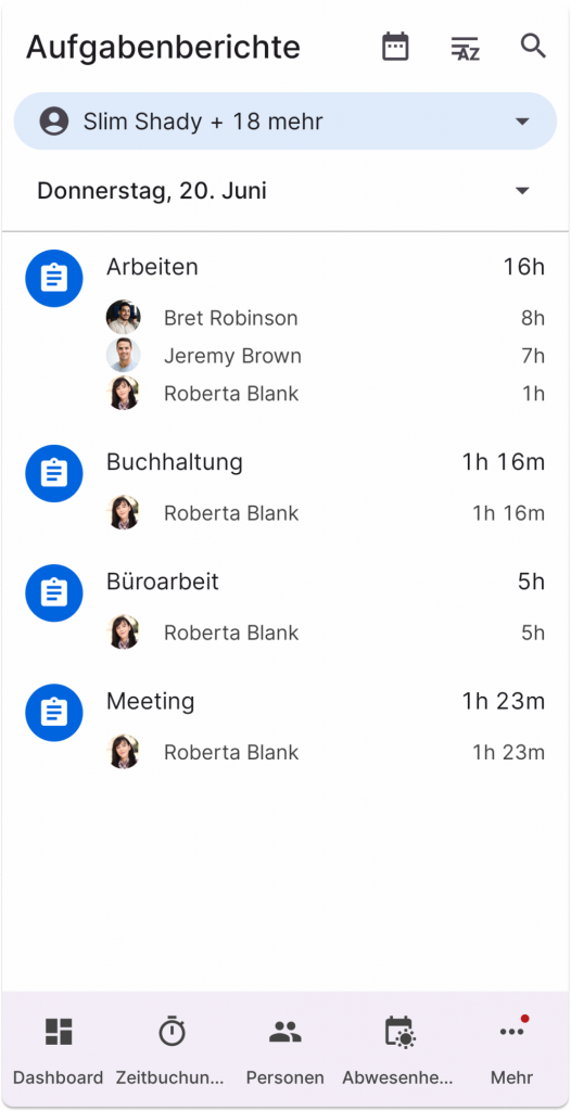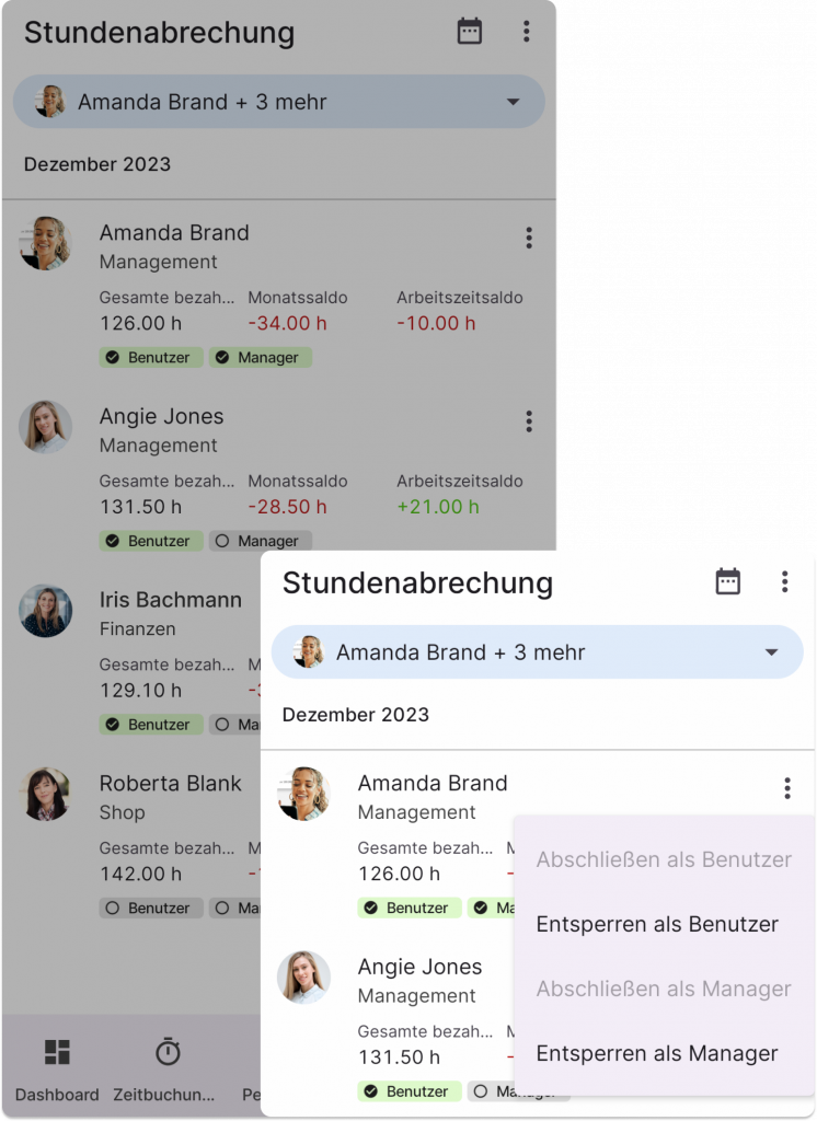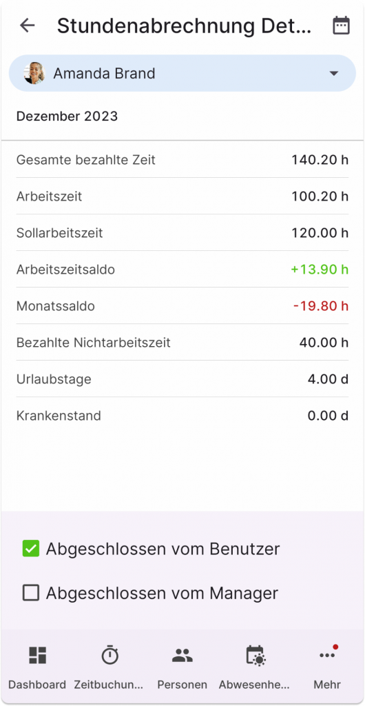 In dieser Version können Sie jetzt nicht nur auf die Übersicht der Stundenabrechnung zugreifen, sondern auch auf eine detaillierte Ansicht für sich selbst und alle Mitarbeitenden, die Sie verwalten. Tippen Sie dazu einfach auf die Übersicht der Person, die Sie sehen möchten.