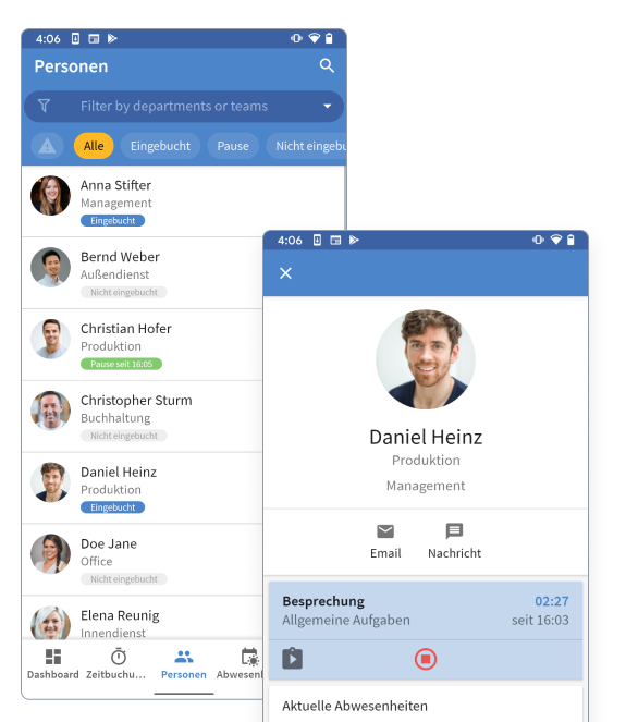 Wir haben die Statusübersicht überarbeitet, damit Sie einfacher und schneller herausfinden können, wer gerade arbeitet und wer abwesend ist. Ein vereinfachter Filter zeigt Ihnen Personen mit einem bestimmten Status, beispielsweise “Pause”.