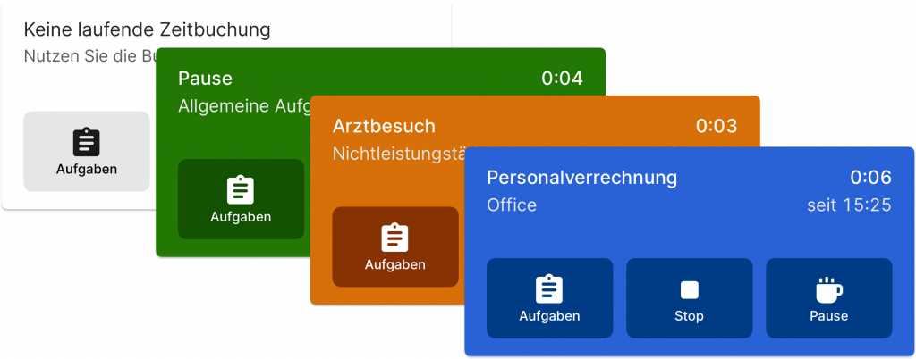Derzeit unterstützen wir das Starten der letzten Aufgabe, Stoppen einer laufenden Zeitbuchung sowie das Buchen einer Pause.