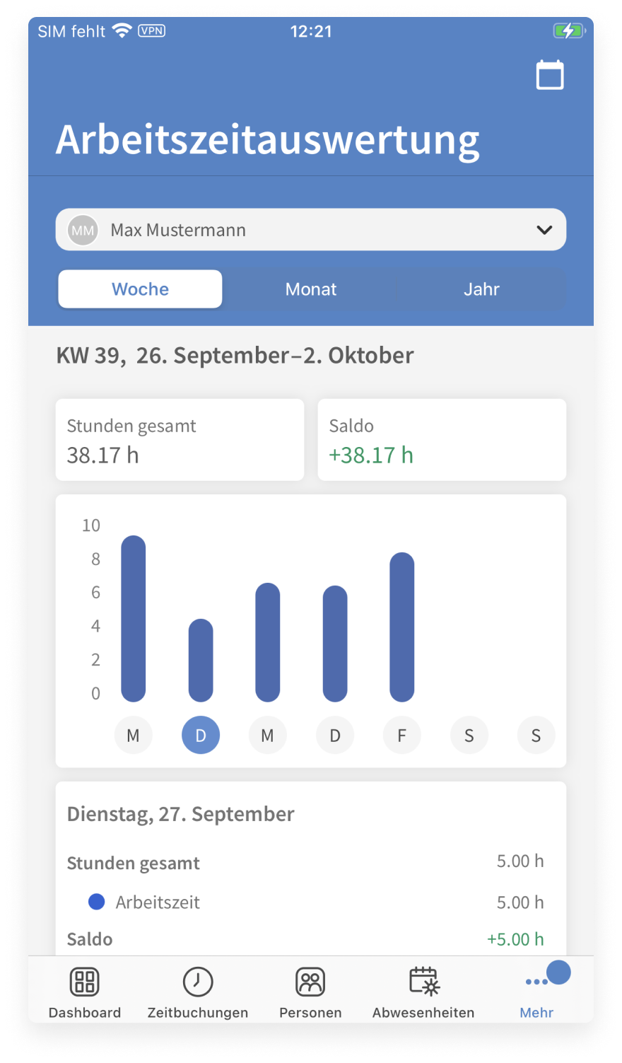 In dieser Version finden Sie im Menü unter Mehr den Menüpunkt Stundenauswertung. Diese gibt Ihnen einen Überblick über Ihre eigene Arbeitszeit und die Ihrer Mitarbeitenden, für die Sie als Manager zuständig sind.