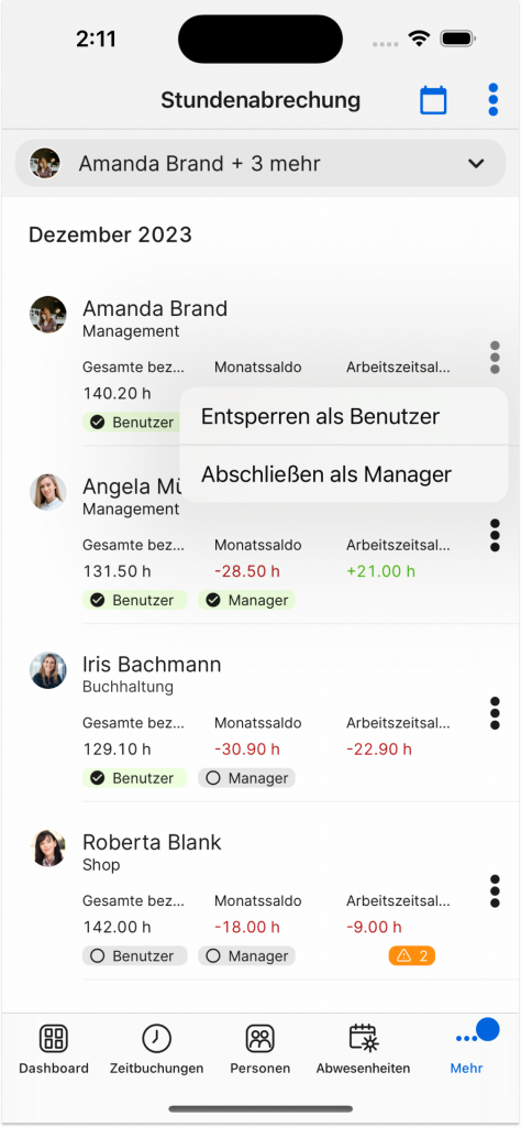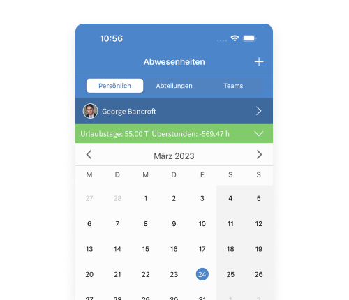 In dieser Version können Sie jetzt nicht nur auf die Übersicht der Stundenabrechnung zugreifen, sondern auch auf eine detaillierte Ansicht für sich selbst und alle Mitarbeitenden, die Sie verwalten. Tippen Sie dazu einfach auf die Übersicht der Person, die Sie sehen möchten.