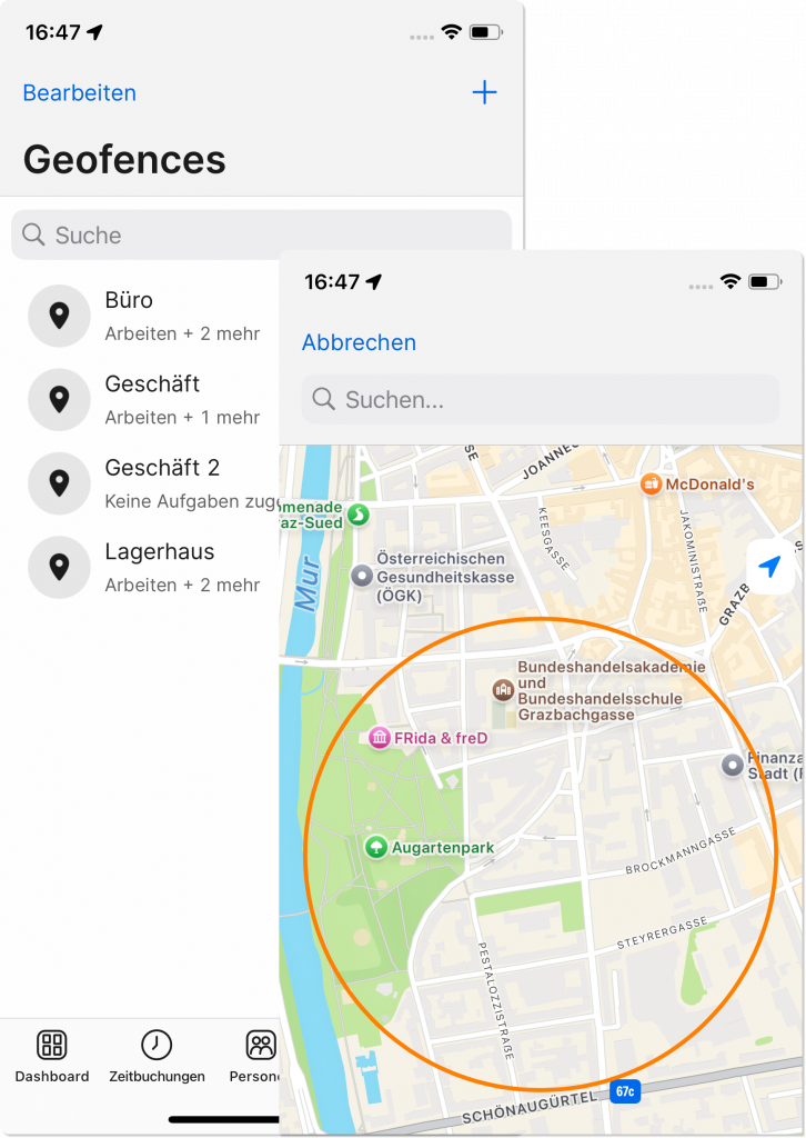 ‚Geofences‘ unterstützt Sie dabei falsche Zeitbuchungen zu vermeiden, indem ausgewählte Aufgaben nur an gewissen Orten gebucht werden können.