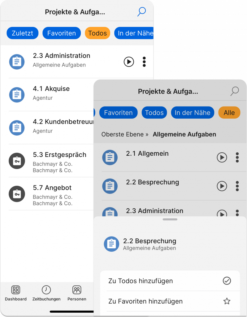 Berechtigte können nun bequem aus der App heraus Aufgaben und Projekte anlegen, bearbeiten und archivieren, wenn das Modul „Projektzeiterfassung“ aktiviert ist. Darüber hinaus können für neu angelegte Projekte ein Auftraggeber und ein Projektleiter ausgewählt und für bestehende Projekte geändert werden.