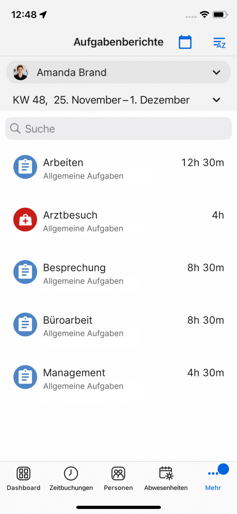 Sie haben die Möglichkeit, diverse Reports und Auswertungen über einzelne Mitarbeitende, einen speziellen Zeitraum, oder über Aufgaben zu erstellen. Diese Funktion gibt es jetzt auch in der mobilen App für Nutzende, welche das Modul „Projektzeiterfassung” NICHT aktiviert haben.