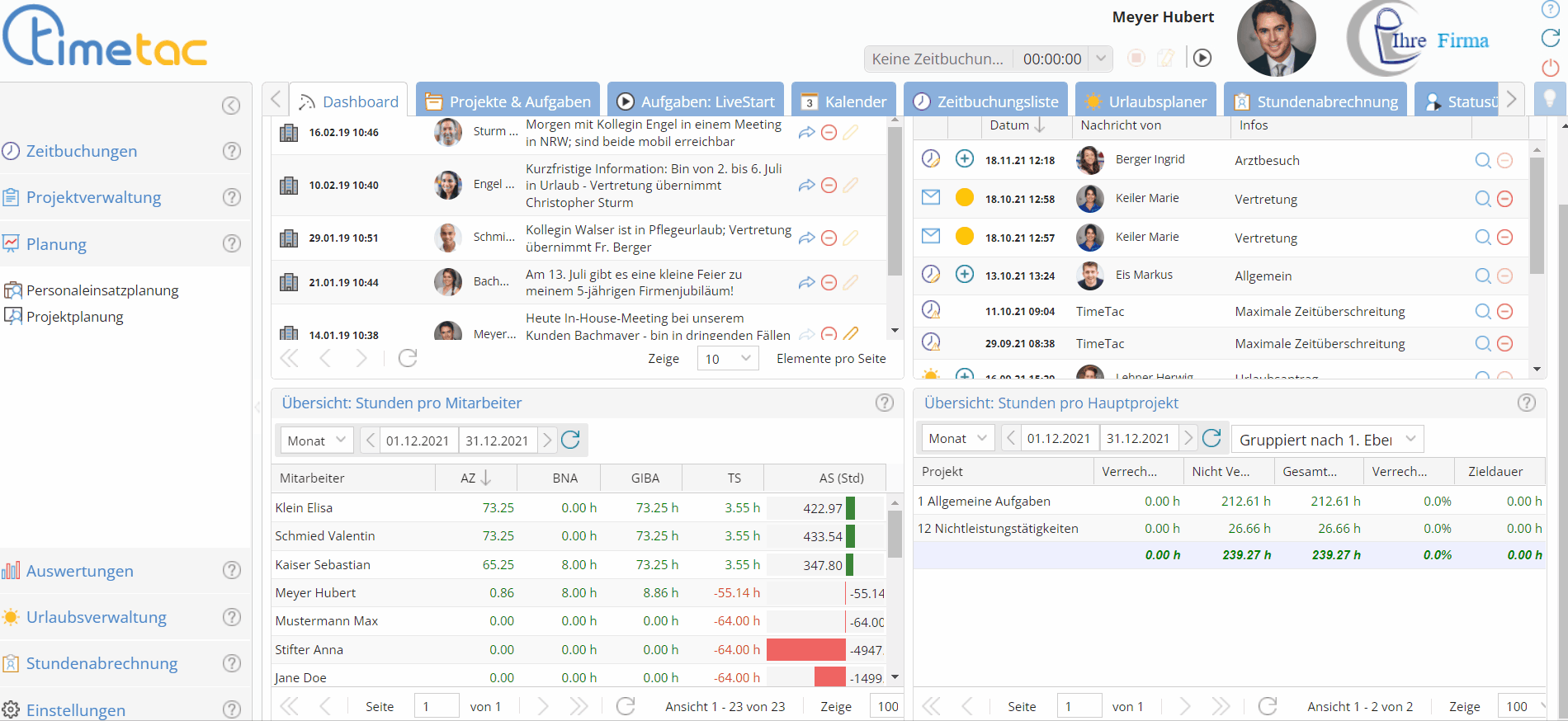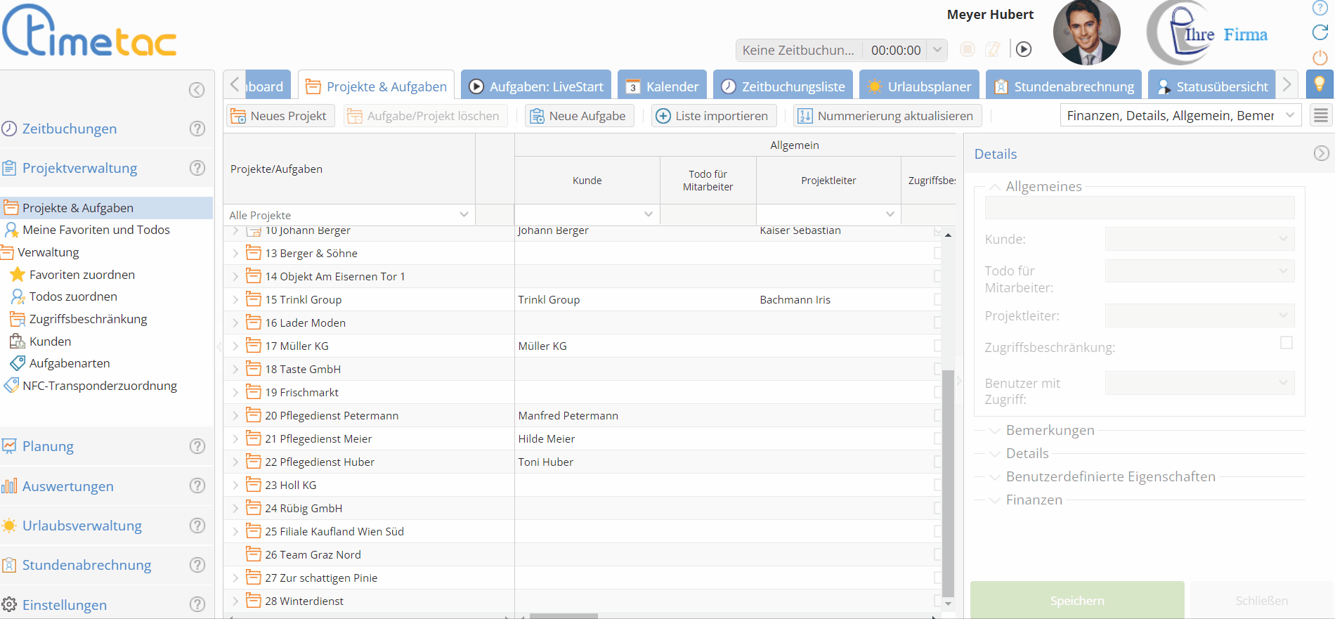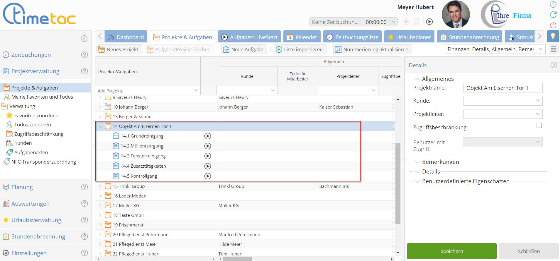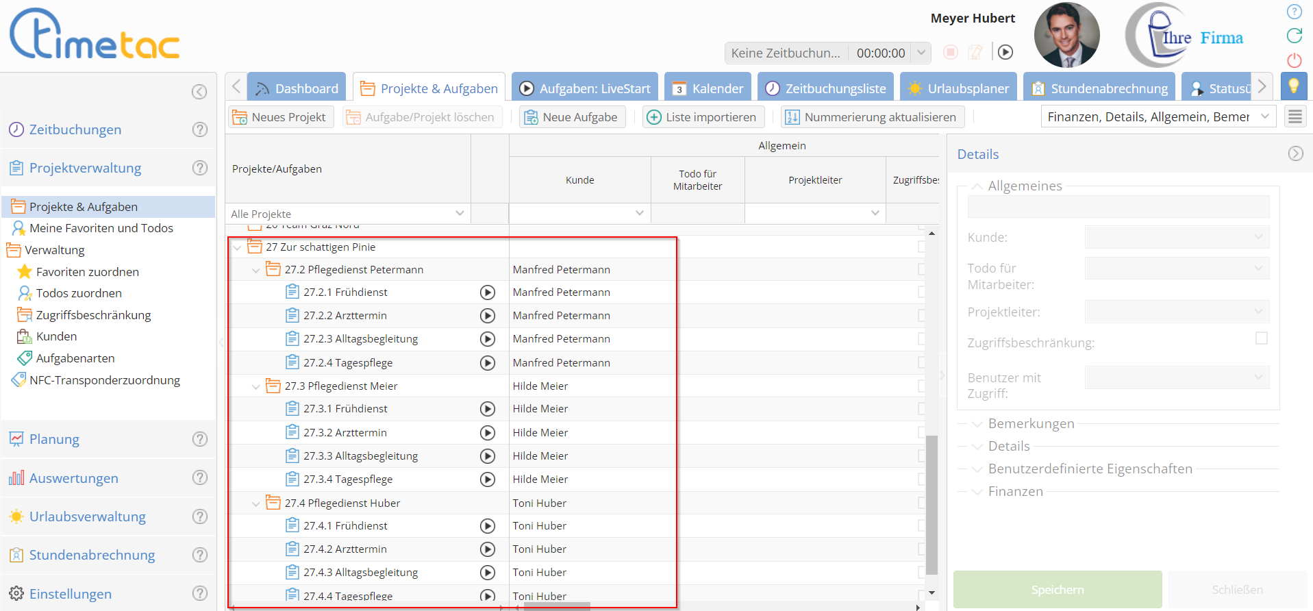 Zeit wird in der Projektzeiterfassung auf Aufgaben gebucht. Pflegedienste, als Beispiel, buchen Zeit pro Patient. Reinigungsfirmen, im Gegensatz dazu, buchen vermutlich Zeit pro Gebäude.