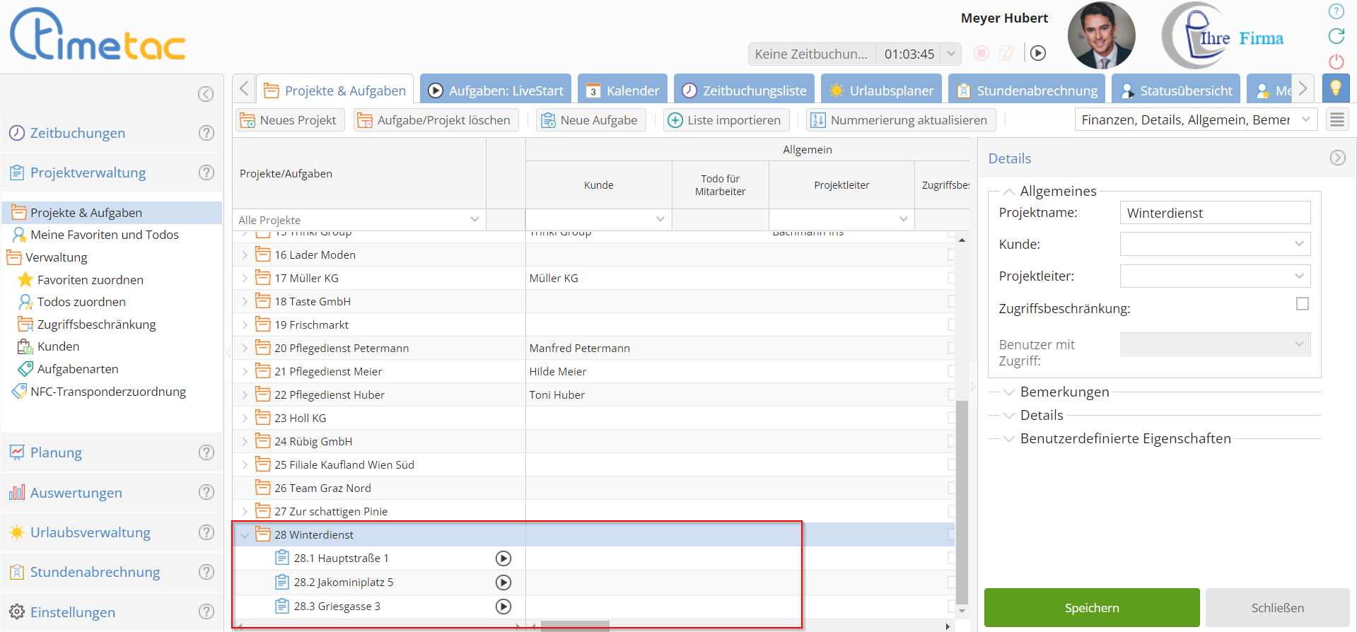 Zeit wird in der Projektzeiterfassung auf Aufgaben gebucht. Pflegedienste, als Beispiel, buchen Zeit pro Patient. Reinigungsfirmen, im Gegensatz dazu, buchen vermutlich Zeit pro Gebäude.