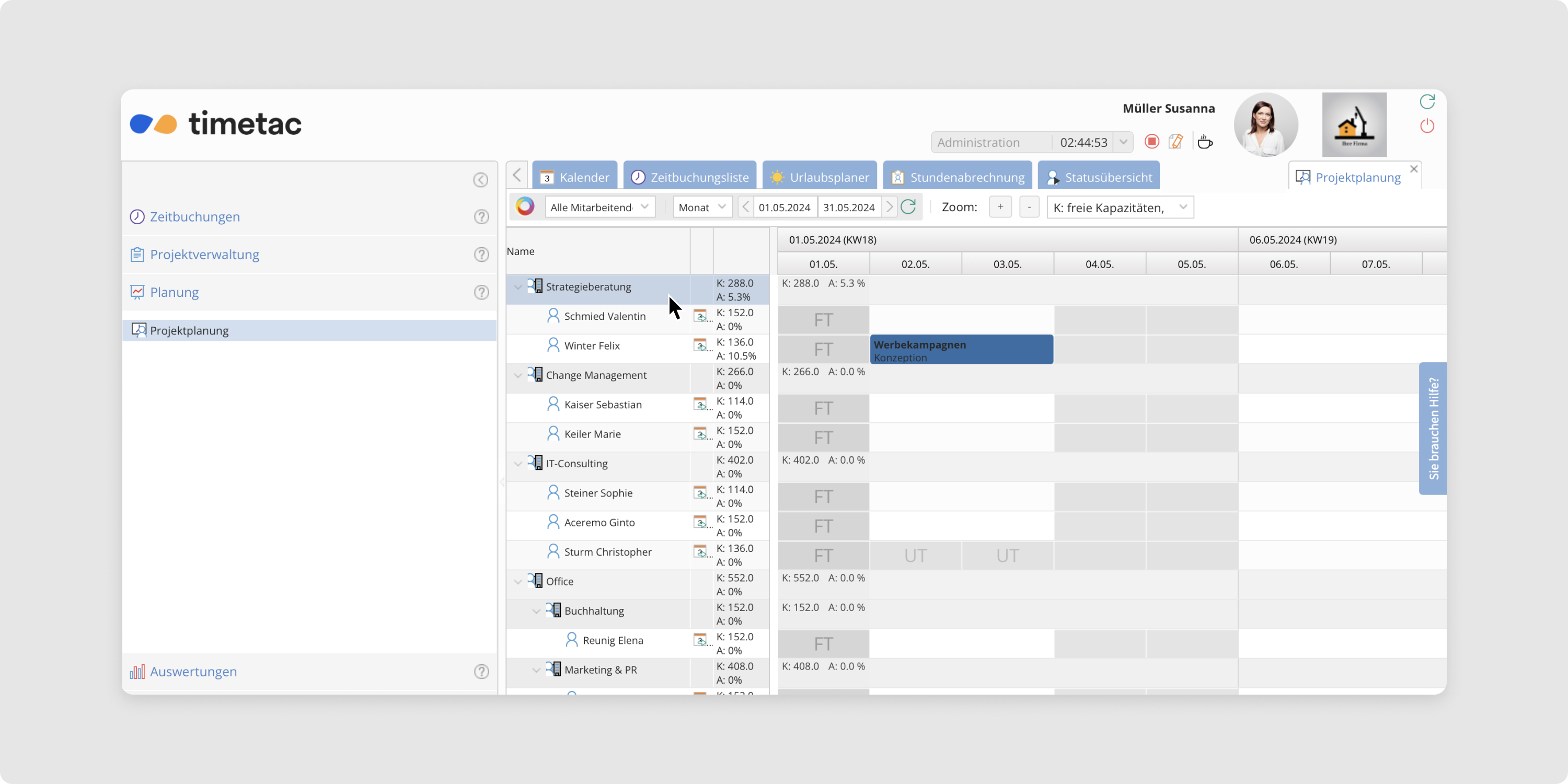 In der Projektplanung von TimeTac werden Ihnen automatisch die freien Kapazitäten beziehungsweise die Auslastung, der bereits verplanten Kapazitäten in Prozent angezeigt. TimeTac berechnet Ihnen automatisch die freien Kapazitäten. Kapazitäten werden in Arbeitsstunden angezeigt.
