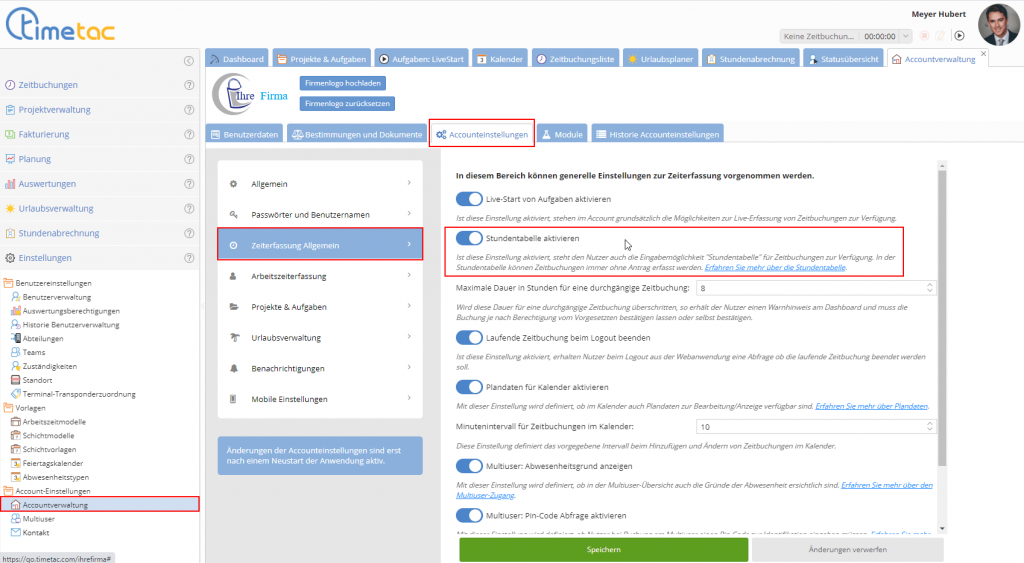 Die Stundentabelle ist standardmäßig nur für nachträgliche Projektzeiterfassungsaccounts freigeschalten. Falls Sie die Stundentabelle auch für Ihre live Projektzeiterfassung verwenden möchten, aktivieren Sie diese in den Account-Einstellungen