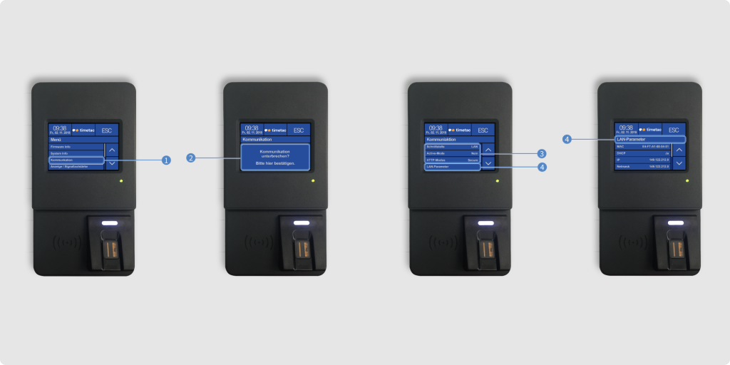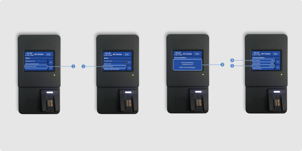 Berühren Sie dazu das TimeTac Logo für drei Sekunden, tippen dann auf Systemmenü Bios > Kommunikation > Kommunikation unterbrechen > Schnittstelle.