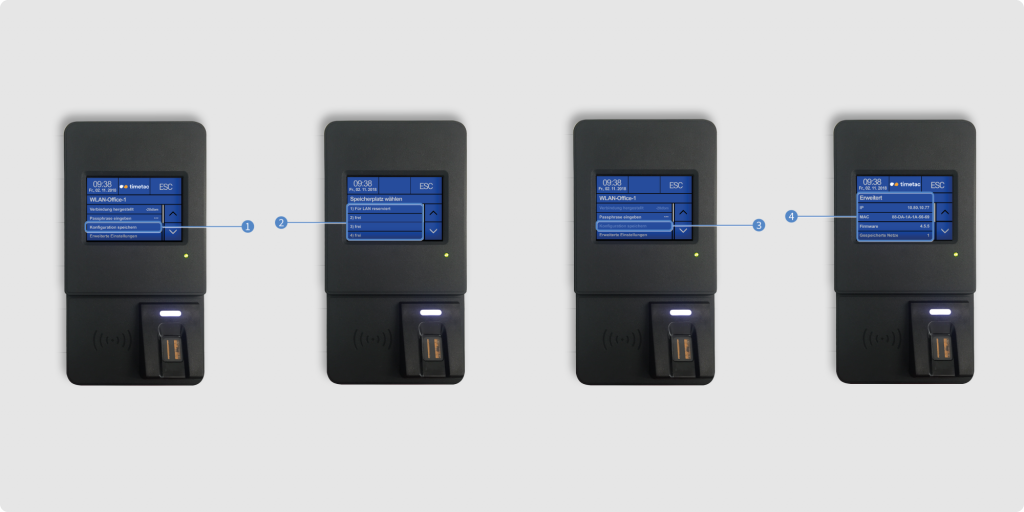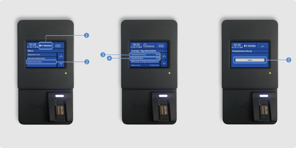 Für umfassendere Konfigurationen an Ihrem Terminal müssen Sie das System-Bios-Menü öffnen, indem Sie 3 Sekunden lang das TimeTac Logo (1) berühren.