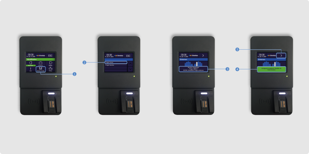Nach erfolgreicher Eingabe wählen Sie die Option “Finger lernen” (2) aus und halten den bereits einem Mitarbeiter zugewiesenen Transponder an das Terminal. Danach können die Fingerprints des betreffenden Mitarbeiters eingelernt werden.