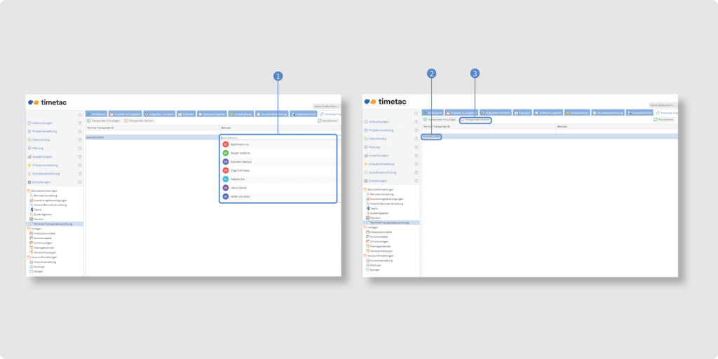 Falls ein/e Benutzer/in ausscheiden sollte, löschen Sie den Transponder und lesen diesen danach neu ein. Klicken Sie dazu im Menü Terminal-Transponderzuordnung in die Zeile des betreffenden Transponders (2). Sobald die Zeile mit der Transponder-ID und dem Namen des ausscheidenden Mitarbeiters blau unterlegt ist, klicken Sie auf den Button Transponder löschen (3).