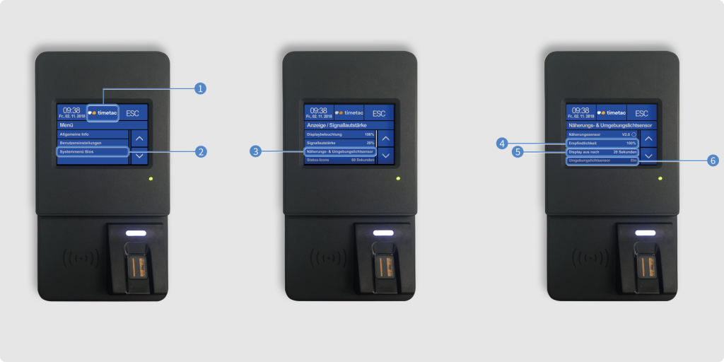 Der Näherungssensor veranlasst Ihr Terminal, den Bildschirm abzuschalten, wenn es gerade nicht benutzt wird. Kommt ein Mitarbeiter dem Terminal näher, wird der Bildschirm automatisch wieder aktiviert, da der Näherungssensor die Bewegung wahrnimmt. Das Terminal kann sofort wieder und ohne Zutun des Mitarbeiters benutzt werden. Bestimmen Sie im entsprechenden Menü die Empfindlichkeit des Sensors (4) sowie die Zeit, nach welcher das Display in den Ruhezustand wechseln soll (5).