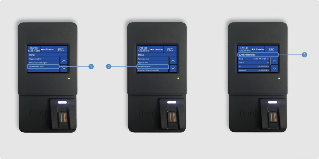 Im unteren Bereich des Terminals sehen Sie das Transponderlesegerät (2) und rechts davon das Fingerprintlesegerät (3).