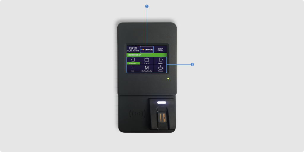 Sie sehen die verschiedenen Tasten Kommen, Gehen, G.m.G. (sofern auf Ihrem Terminal aktiv), Pause und Info am Startdisplay (1). Das Transponderlesegerät befindet sich im unteren Bereich des Geräts (2).