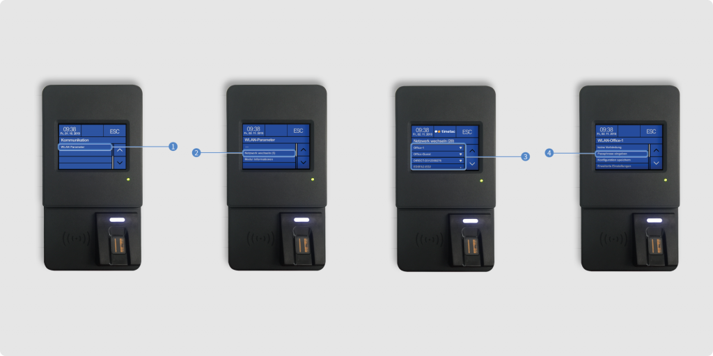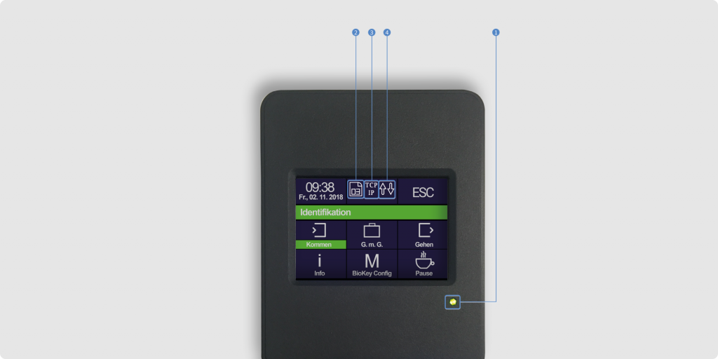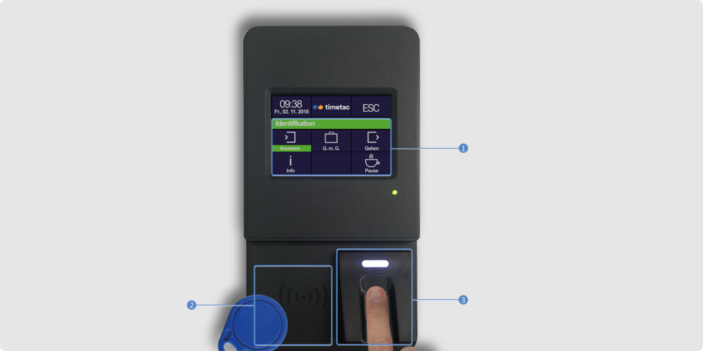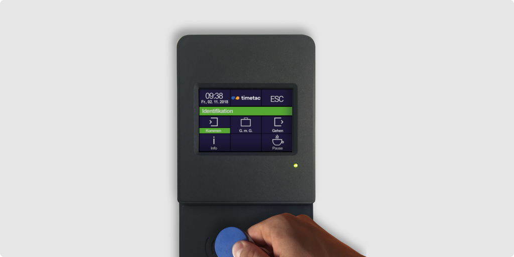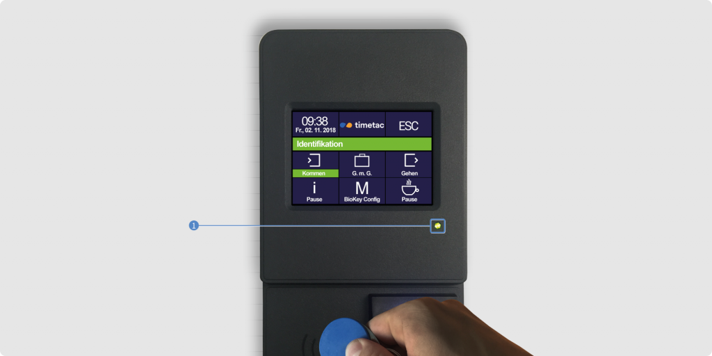 Falls Sie eine Zeitbuchung nicht via Fingerprint, sondern via RFID-Transponder starten möchten, dann tippen Sie nach Auswahl von “Kommen”, “Gehen” oder “Pause” zusätzlich noch auf ESC – darauf hin wechselt die Farbe der Kontrollleuchte von weiß auf rot. Das RFID-Transponderlesegerät ist nun aktiviert, sodass Sie Zeitbuchungen via Transponder starten/stoppen können.
