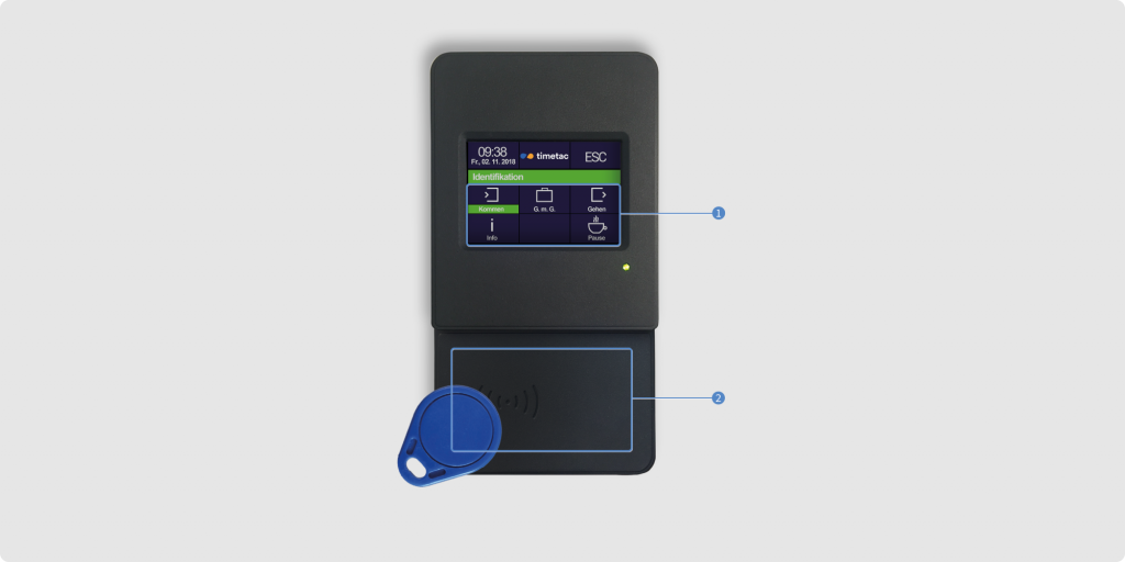 Sie sehen die verschiedenen Tasten Kommen, Gehen, G.m.G. (sofern auf Ihrem Terminal aktiv), Pause und Info am Startdisplay (1). Das Transponderlesegerät befindet sich im unteren Bereich des Geräts (2).