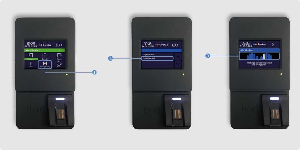 Nach erfolgreicher Eingabe wählen Sie die Option “Finger lernen” (2) aus und halten den bereits einem Mitarbeiter zugewiesenen Transponder an das Terminal. Danach können die Fingerprints des betreffenden Mitarbeiters eingelernt werden.