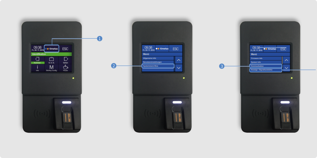 Für umfassendere Konfigurationen an Ihrem Terminal müssen Sie das System-Bios-Menü öffnen, indem Sie 3 Sekunden lang das TimeTac Logo (1) berühren.