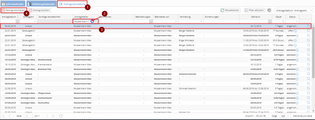 - Filtern Sie auf den betroffenen Mitarbeiter in der Spalte „Antragssteller“