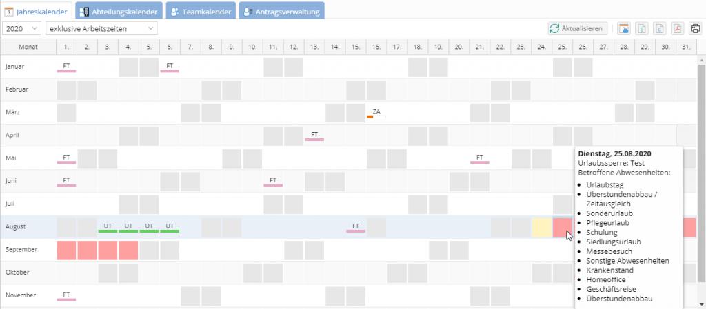 Ihre Mitarbeiter sehen die Urlaubssperre und für welche Art von Abwesenheit dieser gilt, im Jahres-, Abteilungs– und falls aktiviert im Teamkalender.