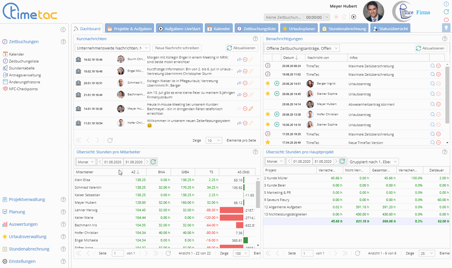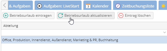 Wenn ein Benutzer die Abteilung wechselt oder ein neuer Benutzer hinzugefügt wurde, werden bestehende Enträge für den Betriebsurlaub nicht automatisch aktualisiert. Mit einem Klick auf den Button „Betriebsurlaub aktualisieren“ erfolgt ein Eintragung des Betriebsurlaub für die betroffenen Benutzer.