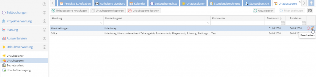 Mit einen Klick auf „Urlaubssperre hinzufügen„, erstellen Sie eine neue Urlaubssperre ein. Um eine bereits vorhandene Urlaubssperre zu kopieren, klicken Sie auf den Button „Urlaubssperre kopieren„. Eine schon vorhandene Urlaubssperre können Sie mit einen Klick auf den Button „Urlaubssperre löschen“ wieder entfernen.