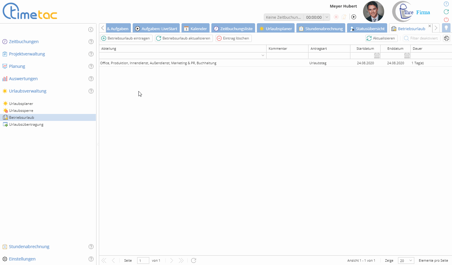 Wenn ein Benutzer die Abteilung wechselt oder ein neuer Benutzer hinzugefügt wurde, werden bestehende Enträge für den Betriebsurlaub nicht automatisch aktualisiert. Mit einem Klick auf den Button „Betriebsurlaub aktualisieren“ erfolgt ein Eintragung des Betriebsurlaub für die betroffenen Benutzer.