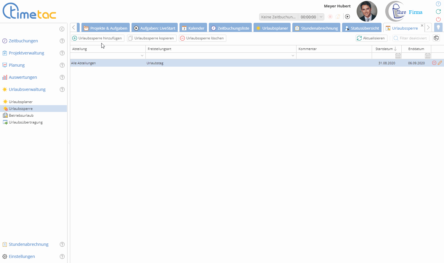 Im Menüpunkt Urlaubsverwaltung im Unterpunkt Urlaubssperre können Sie alle Einstellungen für eine Urlaubssperre vornehmen.