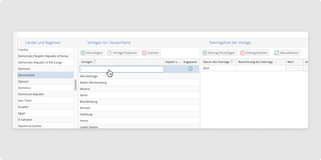 Klicken Sie in der mittleren Spalte auf hinzufügen. Per Doppelklick auf die neu erstellte Zeile, direkt an erster Stelle, können Sie die Vorlage benennen. Fügen Sie nun in der rechten Spalte alle gewünschten Feiertage hinzu.